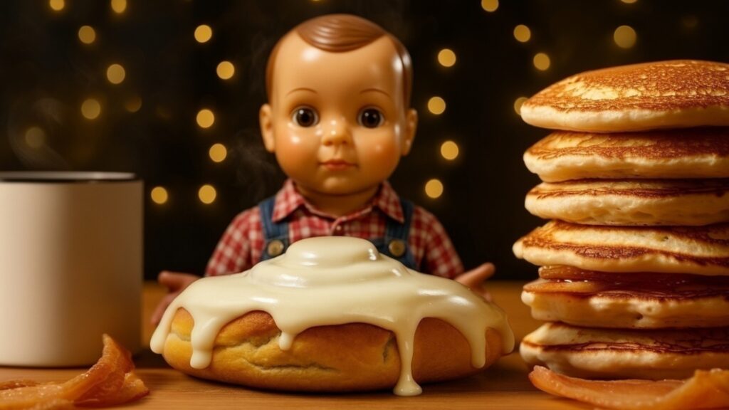 One viral ad features a cinnamon roll roughly the size of a baby’s head — steaming, glossy, unapologetically massive. The caption, “It’s the size of a baby’s head…Only this one doesn’t scream, throw Cheerios, or demand an iPad. – Just sits there. Warm. Sweet. and Perfect!”