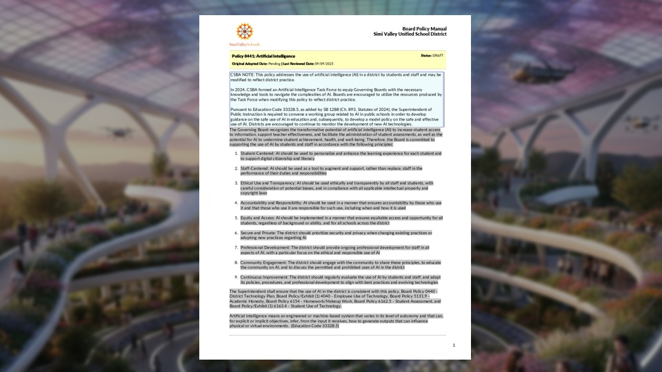 In September 2025, the district’s Board of Education introduced Board Policy 0441 – Artificial Intelligence, a framework that defines how AI should be used by students and staff. The draft policy emphasizes ethical use, equity, and transparency — ensuring that AI supports learning rather than replacing human guidance. It also calls for professional development for teachers, community engagement, and strong privacy protections for student data. While the policy is still in its early stages, it signals that Simi Valley is preparing to bring AI into classrooms safely and thoughtfully.