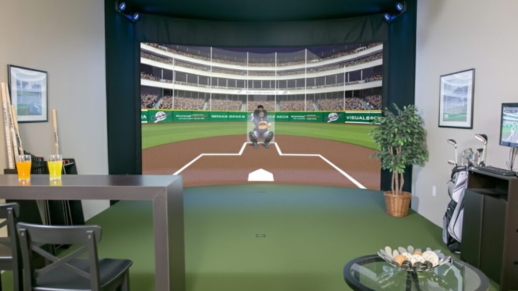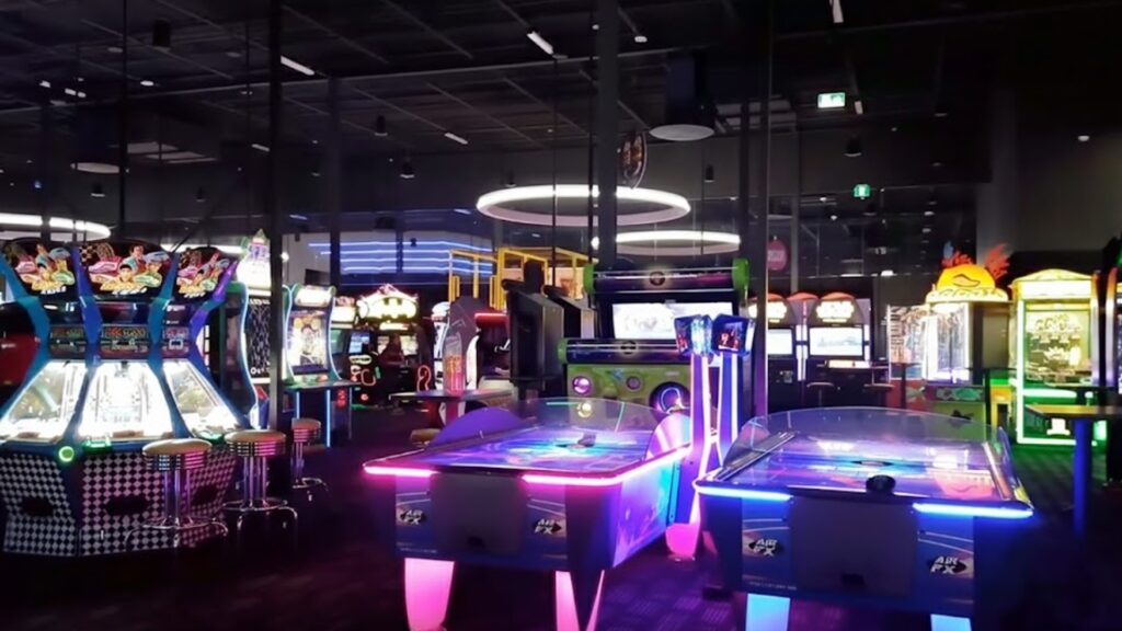 - Viewing lounge with gaming areas, sports simulators, and TVs