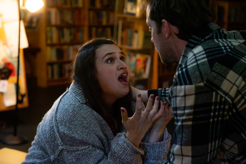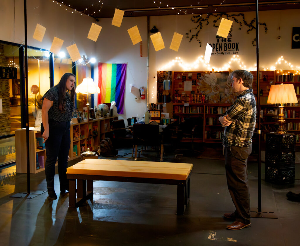 “We chose the bookstore because of the way the show jumps universes,” Ripchik explains. “The audience receives these little snippets of their story in different timelines, played out with different circumstances. The book pages we’ve used to decorate our set are representative of these little snippets of their life story, just like how the play is structured, and the book and pages theme is present in our sound design as well.”