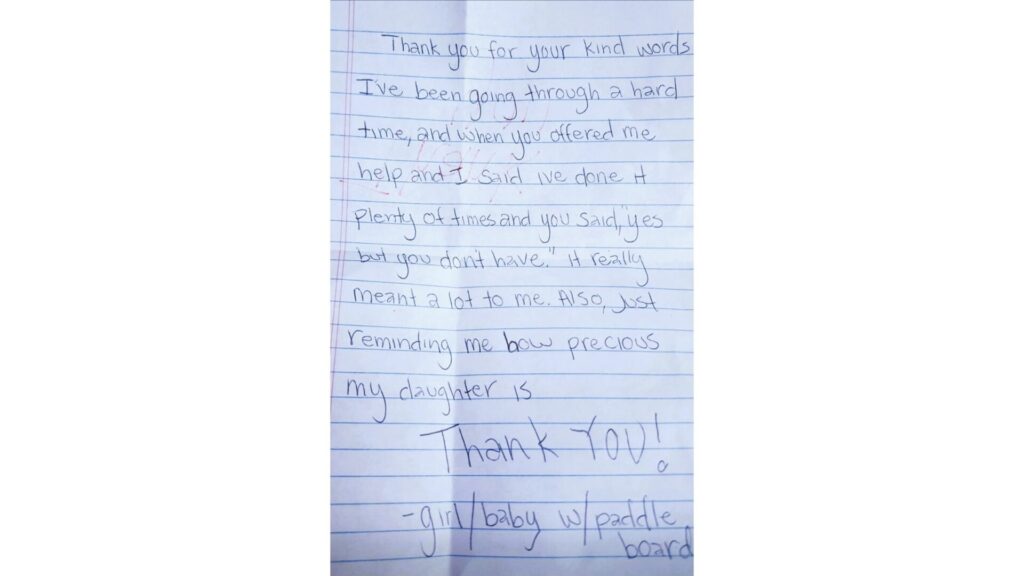 It happened on a regular afternoon at Marina Park in Ventura — the kind of place where strangers pass with a quick hello and not much more. I saw a young mom struggling to carry a paddleboard, her little girl trailing behind. I offered to help. To me, it was nothing big. Her handwritten note later told me it meant much more.