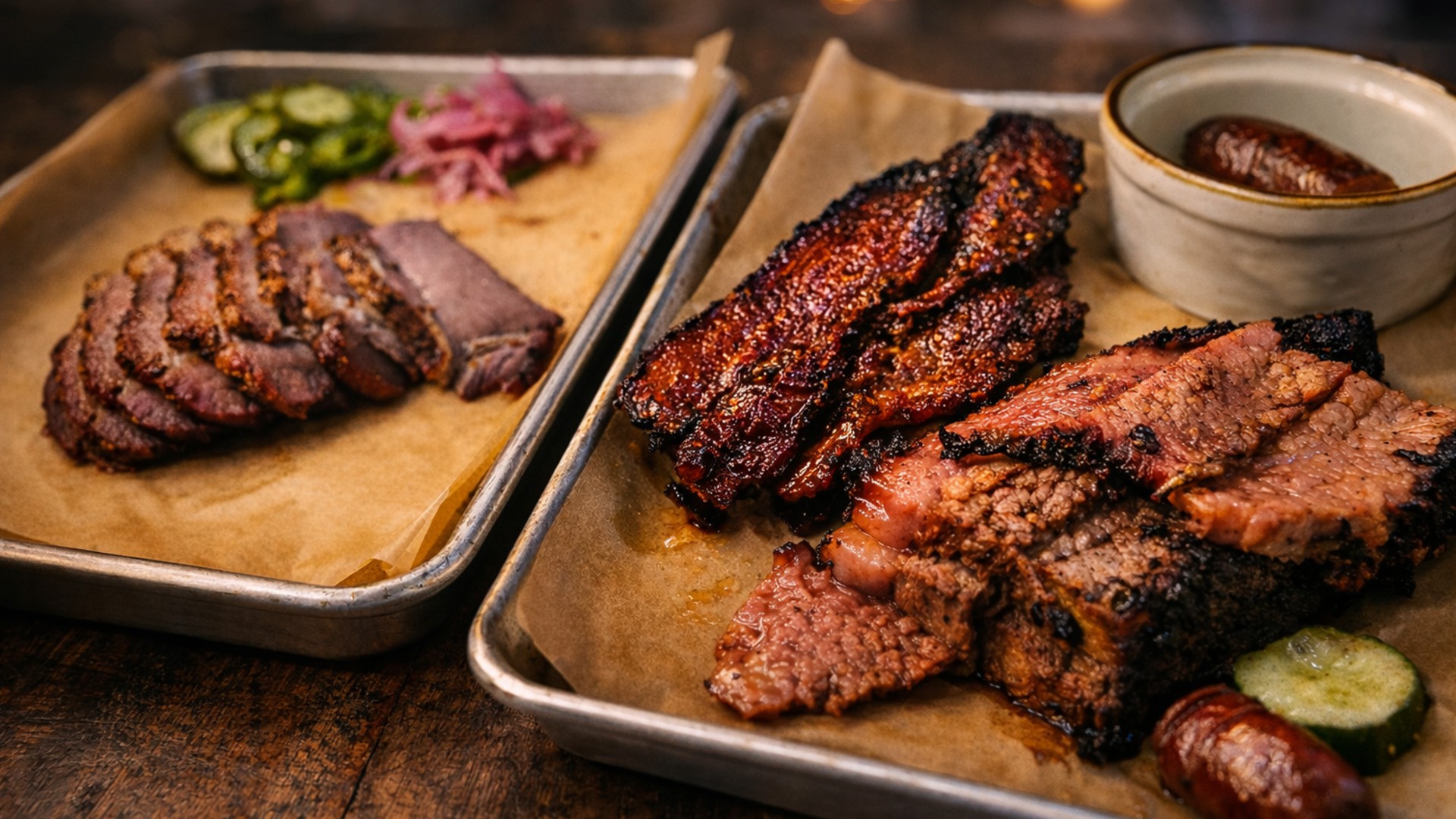 Then there’s the Outlaw Breakfast Platter — three smoked meats before noon. Brisket, pulled pork, or ribs next to BBQ beans and pickled sides. It’s part diner, part smokehouse, all delicious.