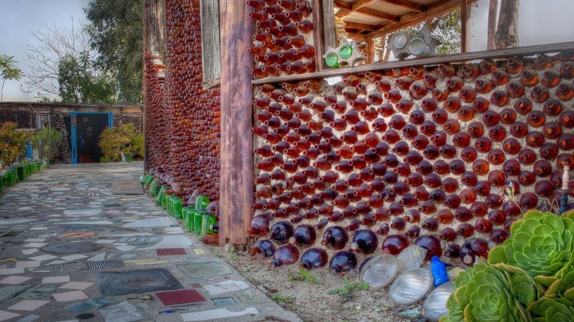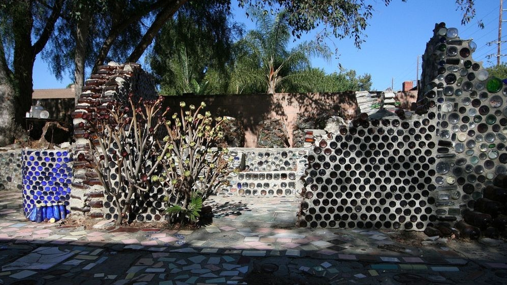 Over 25 years, Prisbrey transformed her one-third acre property into a dense landscape of shrines, wishing wells, walkways, fountains, follies and 15 small structures built to house her collections. Everything was made from found materials, most notably tens of thousands of discarded bottles, which gave the village its name.
