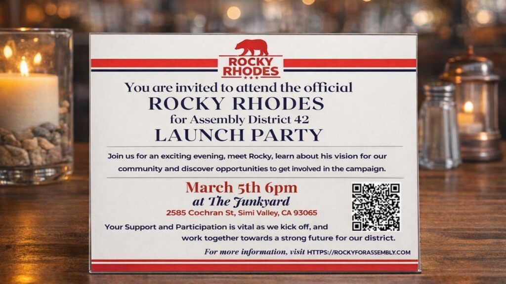 The official Rocky Rhodes for Assembly District 42 Launch Party takes place March 5 at 6 p.m. at The Junkyard, 2585 Cochran Street, Simi Valley, CA 93065. Residents can come meet Rhodes face to face, ask questions, and hear his vision for the district. Volunteers are welcome. Neighbors are welcome. First-timers are welcome too.