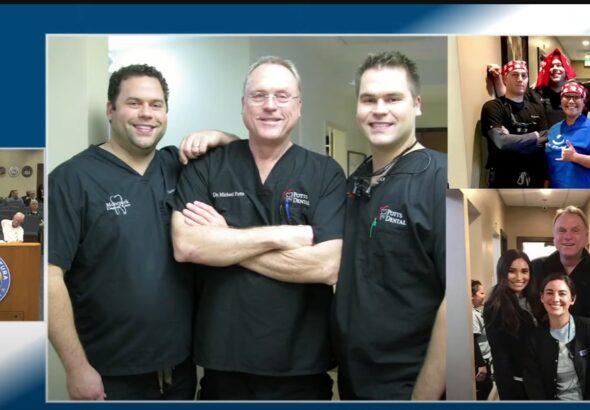 Screenshot from Ventura County Board of Supervisors meeting. In the center photo, Dr. Zachary Potts (left) stands with his father and brother—both fellow dentists. Potts credited his late father’s...